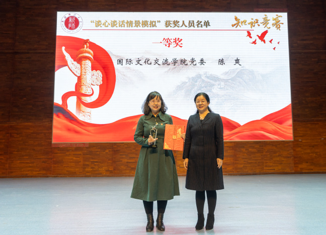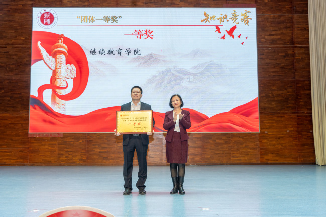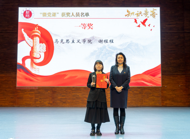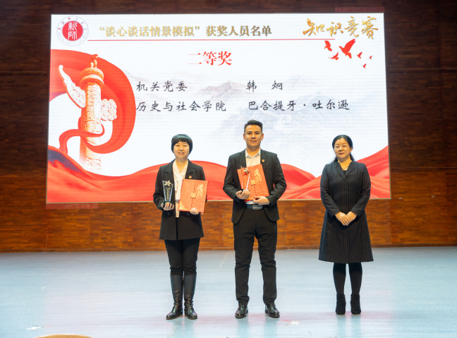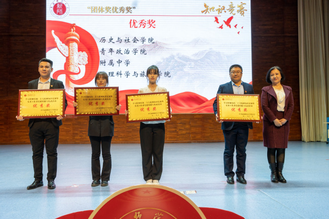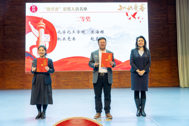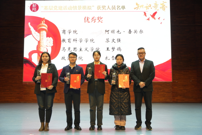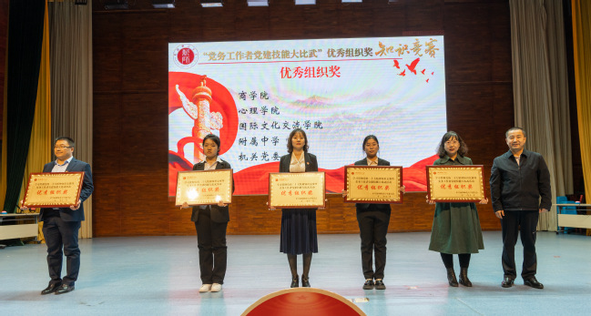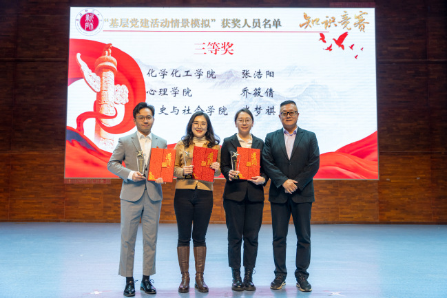决赛阶段以知识竞赛的形式展开,经过必答题、抢答题、风险题三个环节,最终评选出团体一等奖1个,二等奖2个,三等奖3个,优秀奖4个。决赛同时表彰了在初赛阶段微党课环节、谈心谈话情景模拟环节、基层党建活动情景模拟环节的30名获奖教师和5个优秀组织单位。