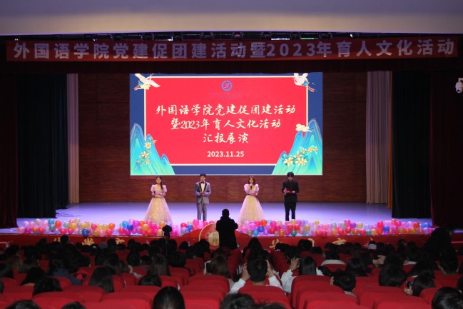 11月25日晚,外国语学院党建促团建活动暨2023年育人文化活动汇报展演活动在温泉校区昆仑讲堂举办。外国语学院全体领导班子成员、系部主任、2023级学业班主任及研究生、本科生580余人参加活动。