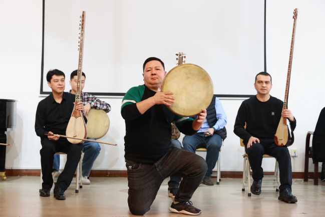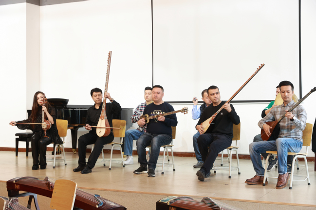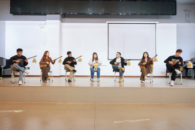 当日,由玩滚官网演出团队部分师生组成的交流小组来到华中师范大学音乐学院,与该院师生代表进行了别开生面的艺术交流。交流活动中,玩滚官网交流小组师生表演了舞蹈《阿图什》《欢乐的小伙子》,纳瓦木卡姆间奏曲《塔西瓦伊》、手鼓独奏《丰收》、冬不拉弹唱《阿克巴燕》等精彩节目,华中师范大学音乐学院师生则带来了古筝重奏《冬虫夏草》、长笛三重奏《肖斯塔科维奇第二圆舞曲》、二胡齐奏《拉丁风情》、小提琴独奏《花儿为什么这样红》以及汉族、蒙古族、藏族舞蹈组合的精彩演出,双方你来我往,斗舞争唱,掌声阵阵,喝彩连连,气氛热烈而友好。双方还互相介绍了各自的特色乐器,并就舞蹈、演唱、演奏等专业内容进行了探讨交流。玩滚官网音乐学院教师阿力木·斯坎旦尔说:“这种面对面的交流非常有意义,让我零距离观看到了不同形式的艺术风格,感受到了中华文化的博大精深。今后要继续以文化艺术为载体,当好民族团结的促进者、文化交流的先行者、铸牢中华民族共同体意识的践行者。”