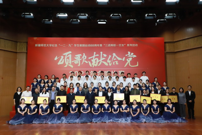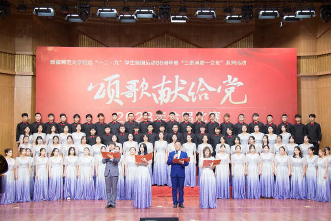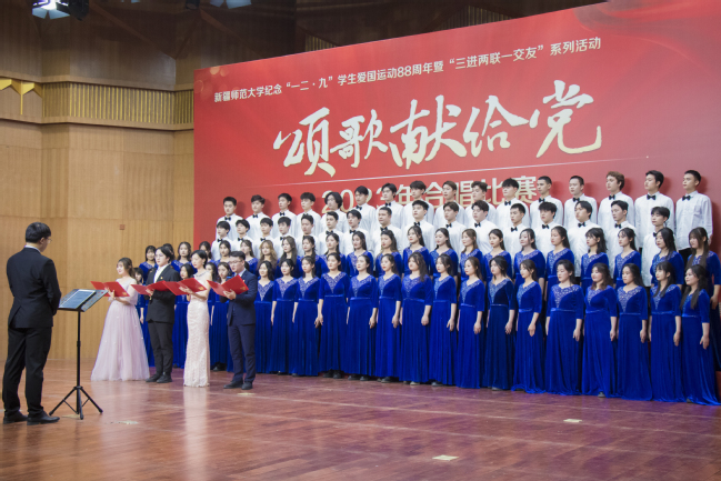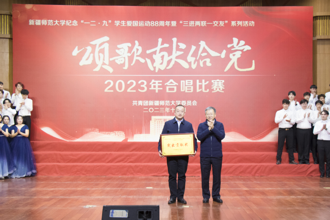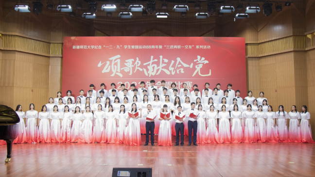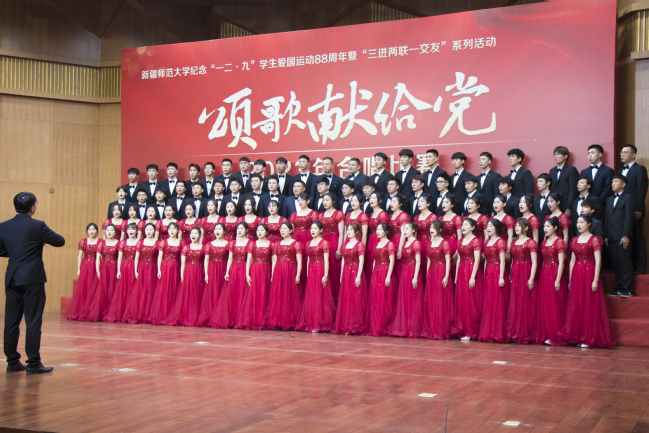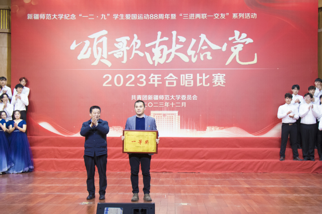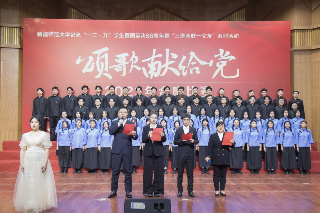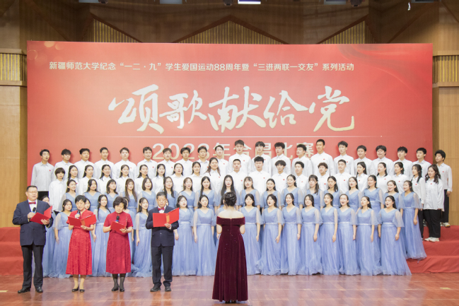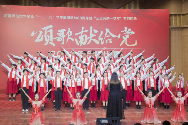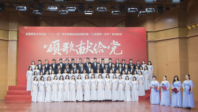 为学习贯彻习近平新时代中国特色社会主义思想,纪念“一二·九”学生爱国运动88周年,丰富“三进两联一交友”与“三强班级”“三好宿舍”活动载体,进一步弘扬爱国主义精神,12月6日,玩滚官网举办纪念“一二·九”学生爱国运动88周年暨“三进两联一交友”系列活动——“颂歌献给党”合唱比赛。校党委书记葛国,校党委副书记王志勇,校党委常委、副校长帕提曼·吐尔逊,校党委常委、副校长帕力旦·吐尔逊,校党委常委、宣传部部长高靖,校党委常委、组织部部长胡毅涛出席活动,相关学院党委书记、院长及11个学院的参赛队伍共1000余人参加活动。