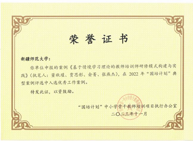 近日,教育部“国培计划”中小学教师培训项目执行办公室发布了《关于公布2022年“国培计划”优秀典型案例的通知》。玩滚官网继续教育学院报送的教师培训典型案例《基于情景学习理论的教师培训师研修模式构建与实践》入选2022年度“国培计划”优秀典型工作案例。据悉,本次全国共评选优秀典型工作案例40项,新疆维吾尔自治区仅此1项。