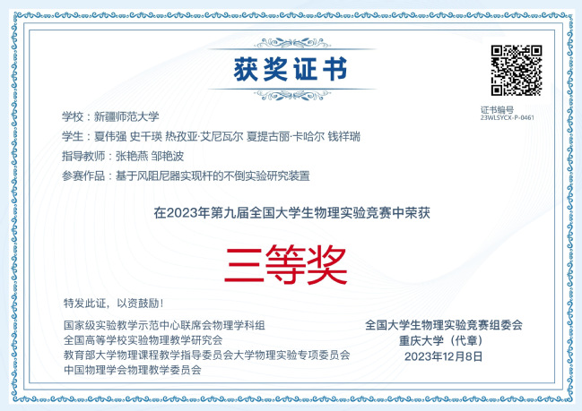 竞赛由国家级实验教学示范中心联席会物理学科组、全国高等学校实验物理教学研究会、教育部大学物理课程教学指导委员会大学物理实验专项委员会、中国物理学会物理教学委员会主办,重庆大学承办,《物理实验》杂志协办。经历复赛、决赛,900余位评审专家对2251项参赛作品进行评审,最终评出“命题类创新作品”“自选课题类创新作品”和“大学生物理实验讲课比赛”三个类别的奖项,332所高校获优秀组织奖。物理与电子工程学院选派的5支代表队喜获佳绩,荣获命题类二等奖1项、三等奖1项,自选类三等奖1项、优秀奖1项,讲课类优秀奖1项,学校获优秀组织奖。