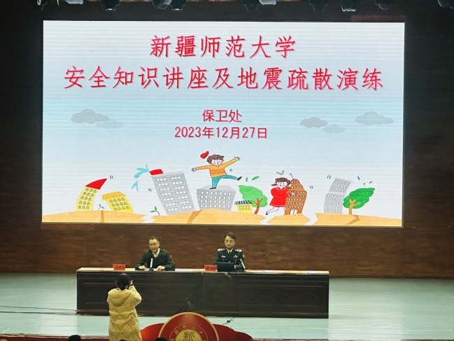 为有效防范地震灾害,最大限度地降低因地震带来的人员伤亡及财产损失,提高师生在面对突发事件时的应急处置和逃生自救、互救能力,根据学校安全生产领导小组安排,玩滚官网于12月27日邀请乌鲁木齐市卫民安安全知识宣教中心,在温泉校区昆仑讲堂开展了防震知识讲座及应急疏散演练。校党委常委、宣传部部长高靖出席活动。