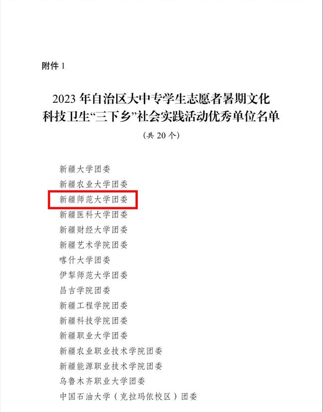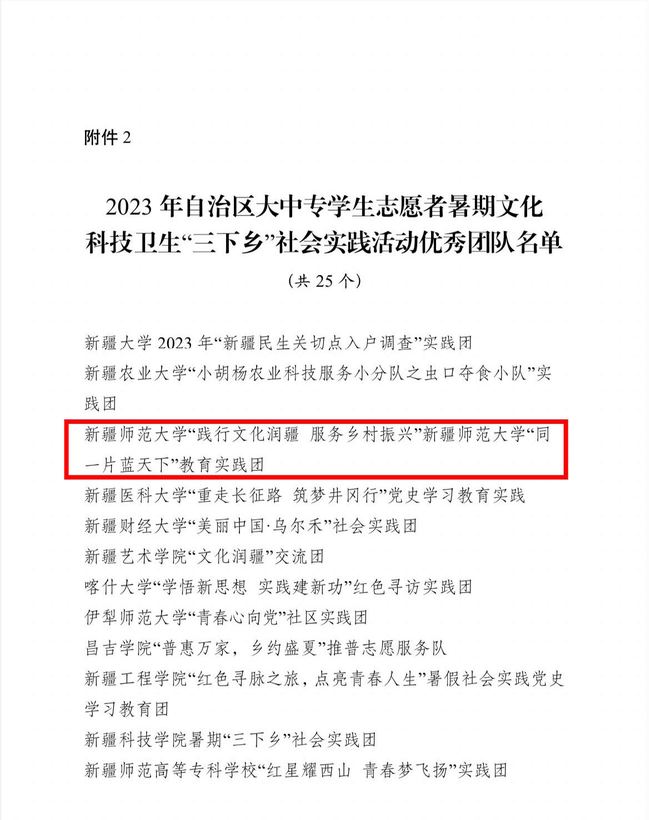 近日,自治区团委公布了《2023年自治区大中专学生志愿者暑期文化科技卫生“三下乡”社会实践活动总结通报结果》,对活动中表现突出的优秀单位、团队和个人进行通报表扬。其中,玩滚官网团委荣获优秀单位,“践行文化润疆服务乡村振兴”玩滚球的十大正规平台“同一片蓝天下”教育实践团荣获优秀团队,校团委办公室主任汪艳霞、马克思主义学院马克思主义中国化研究专业2023级硕士研究生张子帆荣获优秀个人。