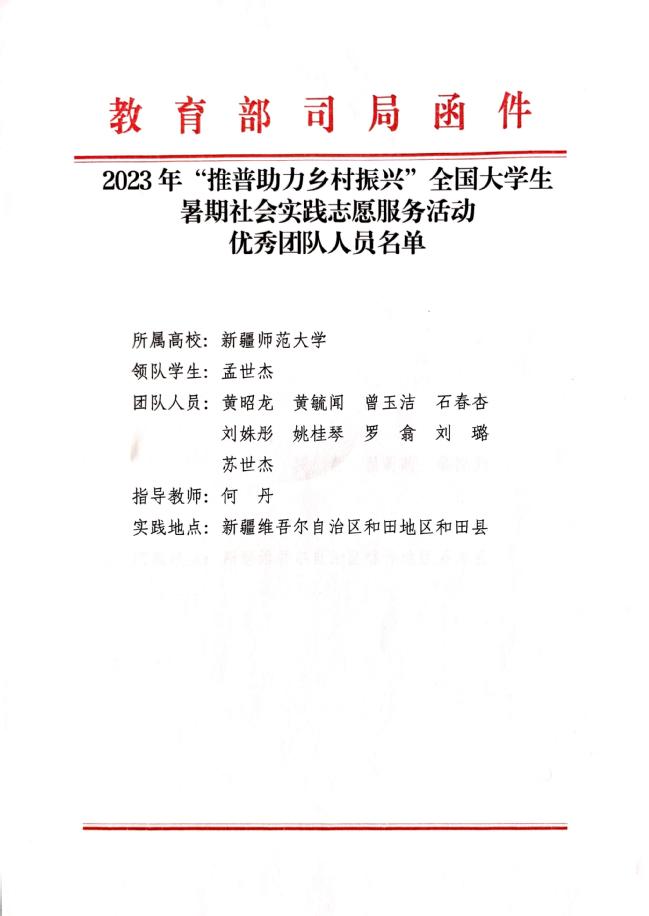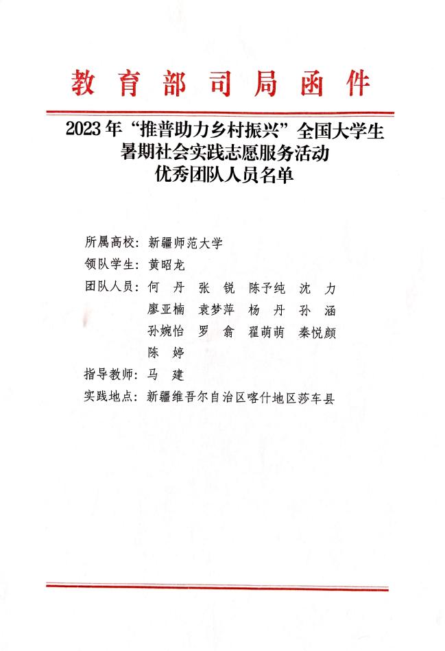 2023年7月至8月,由中国语言文学学院的马建老师担任指导老师,黄昭龙、何丹、张锐、陈予纯、沈力、廖亚楠、袁梦萍、杨丹、孙菡、孙婉怡、罗翕、翟萌萌、秦悦颜、陈婷、汪芸等同学组成的用“‘心’帮扶·‘心’过天晴”推普志愿服务队,赴喀什地区莎车县,深入当地群众开展调研走访,并通过“红色之声传正音”“语贯古今说经典”两支青年宣讲团,在普及日常用语的基础上,把握主题重点,传递党的“好声音”。