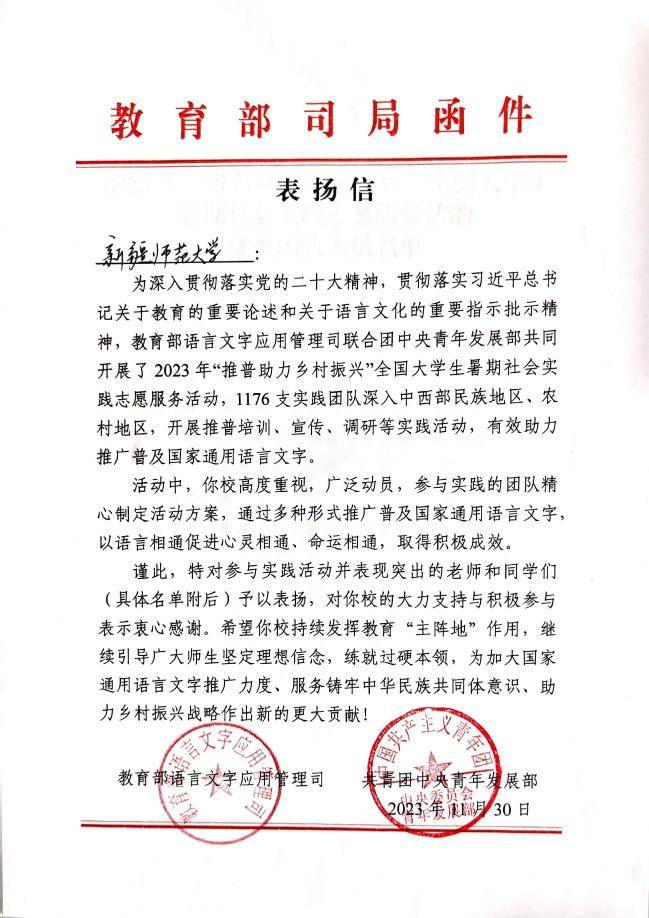 近日,教育部语言文字应用管理司、共青团中央青年发展部向玩滚官网发来表扬信,信中充分肯定玩滚官网在2023年“推普助力乡村振兴”全国大学生暑期社会实践志愿服务活动的积极贡献,对参与活动并表现突出的老师和同学们给予表扬。
