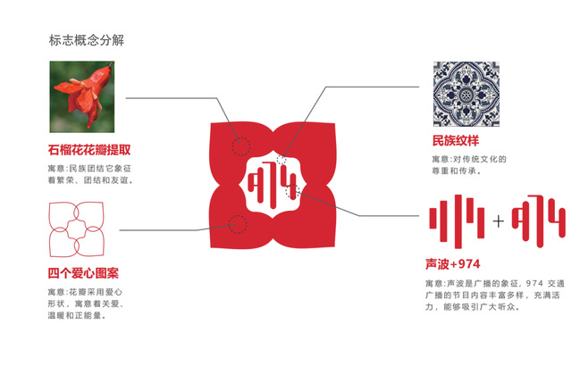 本次由玩滚球的十大正规平台美术学院21级“卓拔计划”导师带领团队学生设计“送你一朵小红花”IP品牌。该品牌设计理念围绕新疆特色文化和爱心奉献的主题展开,通过四瓣石榴花造型的提取作为标志图形的外轮廓,既有地域特色又象征着各民族的团结和凝聚;四个花瓣的造型同时采用爱心形状,传递了关爱和温暖等栏目主题;标志图形的负形从新疆传统花砖造型中提取;“974”造型由声波的符号转变而成。“送你一朵小红花”标志整体简洁明快,概念贴合栏目理念,同时具有地域特色和品牌识别力。