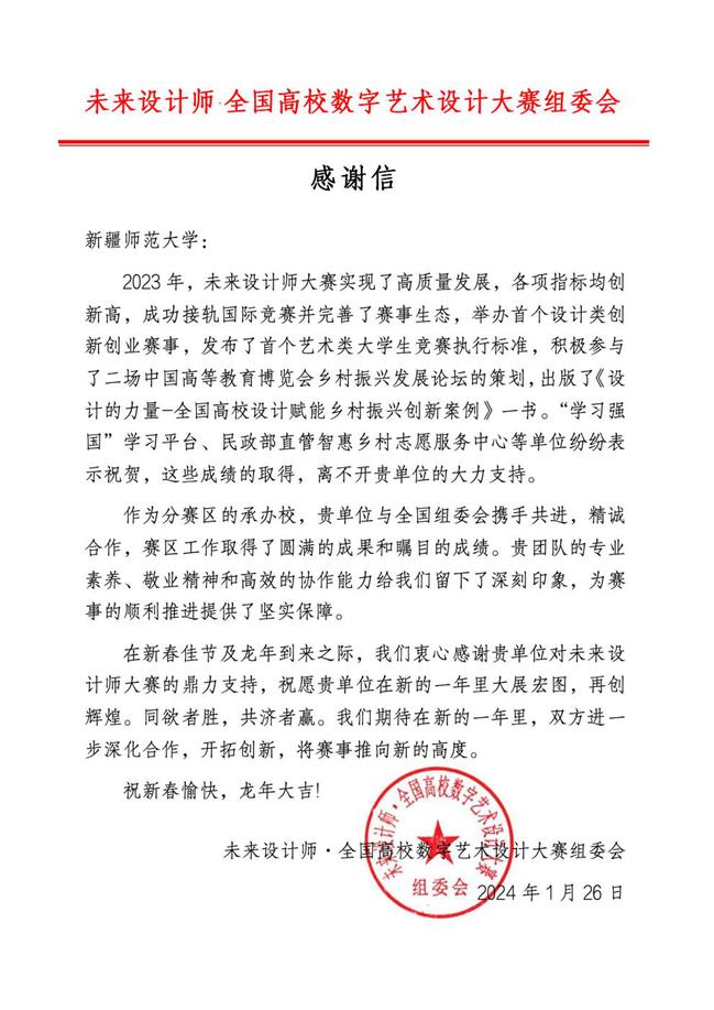 近日,我校收到来自全国高校数字艺术设计大赛组委会的感谢信,对玩滚官网在“未来设计师·全国高校数字艺术设计大赛”成功举办过程中给予的大力支持表示感谢。
