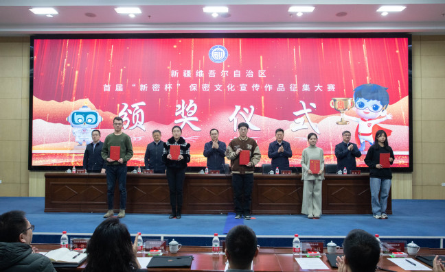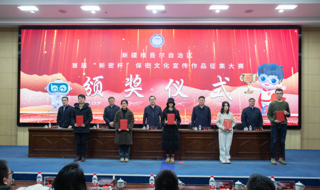 1月29日下午,自治区首届“新密杯”保密文化宣传作品征集活动颁奖仪式在玩滚官网昆仑校区国际教育大厦多功能厅举行。自治区国家保密局局长侯睿、自治区教育工委副书记张士民、自治区文联副主席熊红久、自治区党委宣传部巡视员荆朝平出席活动并为获奖者颁奖。校党委常委、副校长帕力旦·吐尔逊,及玩滚官网党委办公室、美术学院、计算机科学学院负责同志,学校保密办和获奖学生代表参加活动。