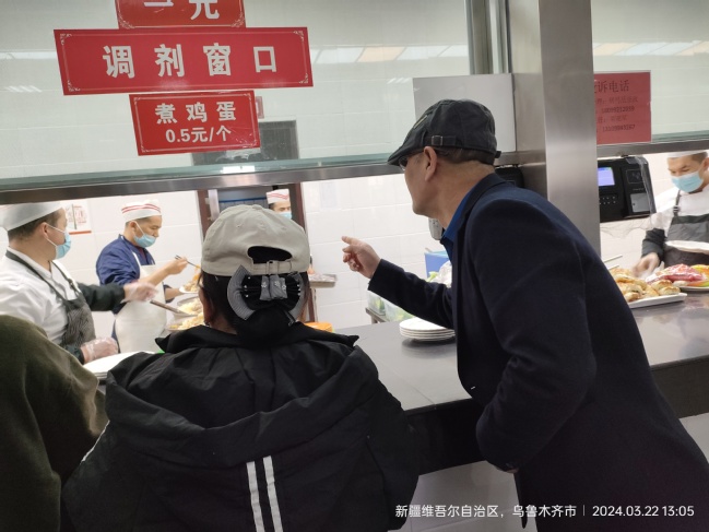 调研结束后,吾满江·艾力与学生在温泉一号餐厅共进午餐。“一顿饭花多少钱”“饭菜口味吃得惯吗”“学习压力大不大”,排队过程中,他与学生亲切交流,了解学生学习生活和思想状况,询问对饭菜质量、种类口味、服务管理等方面的意见建议。