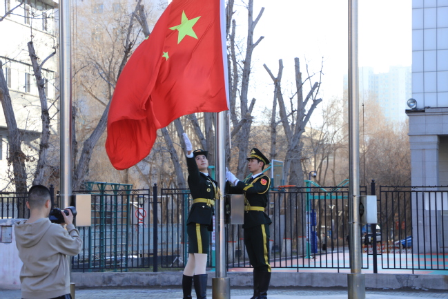 当日上午九时,升旗仪式正式开始,国旗护卫队成员精神抖擞,手持钢枪,步履稳健地护送鲜艳的五星红旗入场。伴随着庄严嘹亮的国歌声,国旗在晨风中迎着朝阳冉冉升起,现场师生满怀崇敬之情庄严肃穆,面向国旗行注目礼。