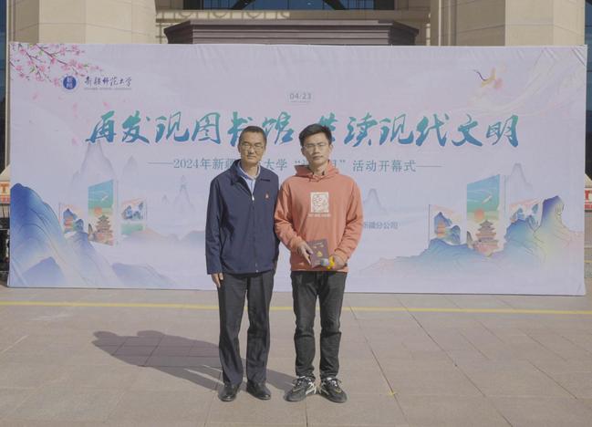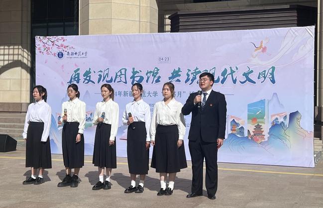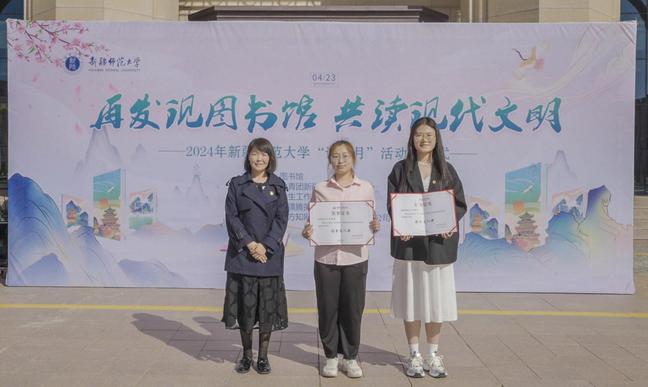 在颁奖环节中,帕力旦·吐尔逊、包瑞、马晓利为获得2023年度图书馆“读书达人”的师生颁发了奖状及奖品。获奖代表尹培芳发表了获奖感言并向大家介绍了图书馆学生社团——新竹读书社,鼓励同学们充分运用好图书馆馆藏资源,为人生积淀打下扎实的阅读基础。姜云琴为获得教育部中国大学生在线2023年度“悦读青春”全国百场百所百名读书特色推选展示活动“读书达人类优秀作品”的两位同学颁发了奖状。