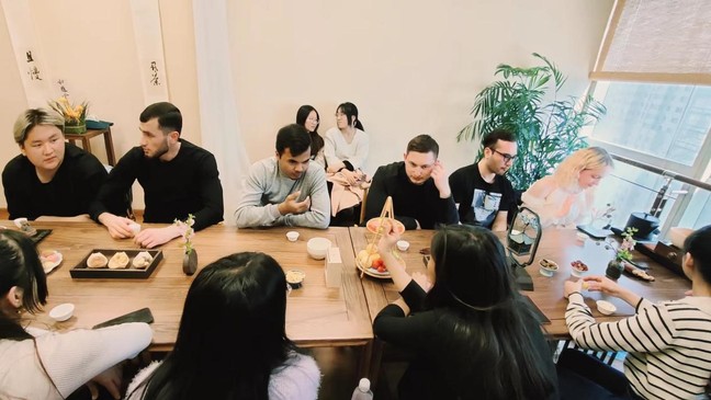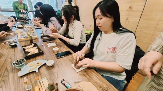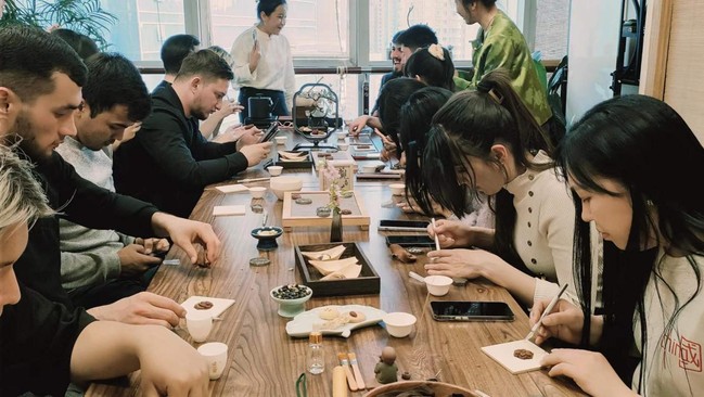 香牌是一种传统的中国香文化产品,通常由珍贵的香料制成,不需要经过烧薰就能散发香气,具有装饰和养生双重功效。品茶之余,留学生们跟随茶艺师学习拥有2500年历史的茶香文化,了解香牌的历史及佩戴方式,体验闻线香与制香牌,感受融合传统与现代的独特香气。