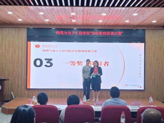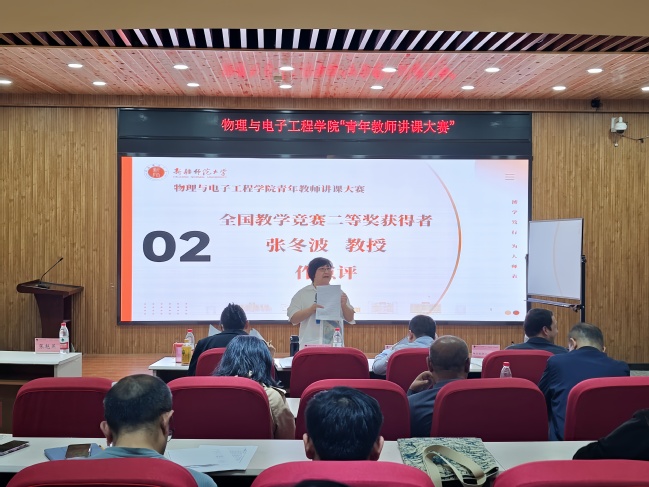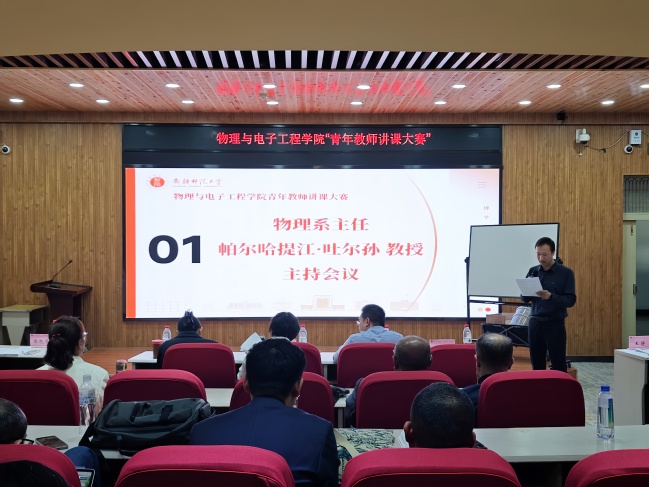 为进一步落实立德树人根本任务,引领青年教师不断更新教育理念、创新教学方法、优化教学过程,提升教育教学质量,5月8日下午,物理与电子工程学院在昆仑校区文史楼2楼议课厅举办了青年教师讲课比赛。比赛由物理系主任帕尔哈提江·吐尔孙教授主持,物理与电子工程学院全体教师观摩比赛。