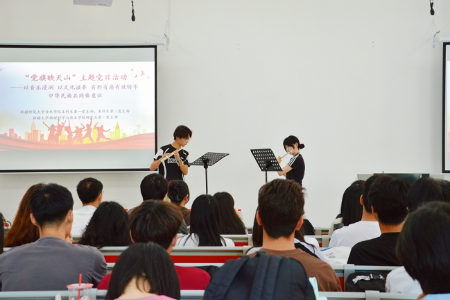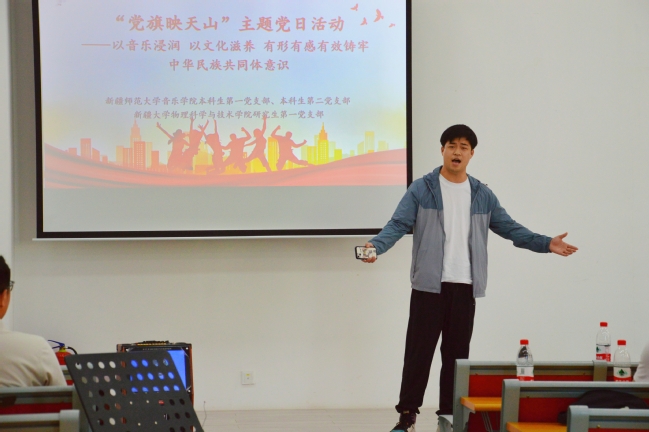 为激励党员青年踔厉奋发、担当实干、团结奋斗精神,加强支部间学习交流,切实推动提升组织引领力、组织力、服务力、战斗力,5月22日下午,玩滚官网音乐学院本科生第一党支部、第二党支部联合新疆大学物理科学与技术学院研究生第一党支部,在新疆大学物理科学与技术学院共同开展“以音乐浸润、以文化滋养、有形有感有效铸牢中华民族共同体意识——‘党旗映天山’主题党日活动”。玩滚官网音乐学院辅导员帕瑞、新疆大学物理科学与技术学院辅导员田列、音乐学院本科生第一、二党支部,物理学研究生第一党支部共计60人参加活动。