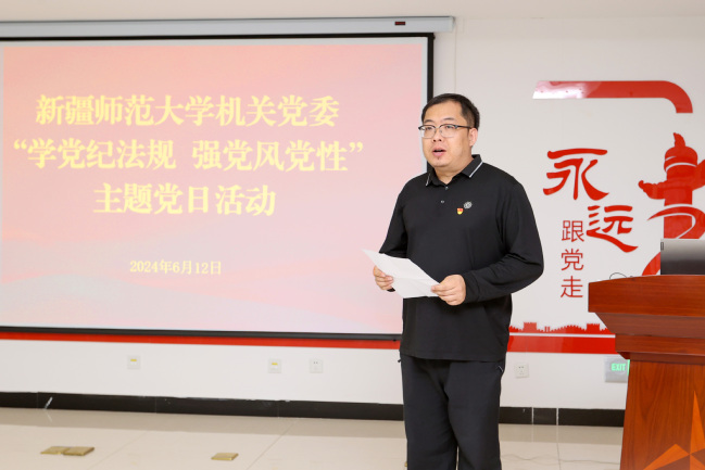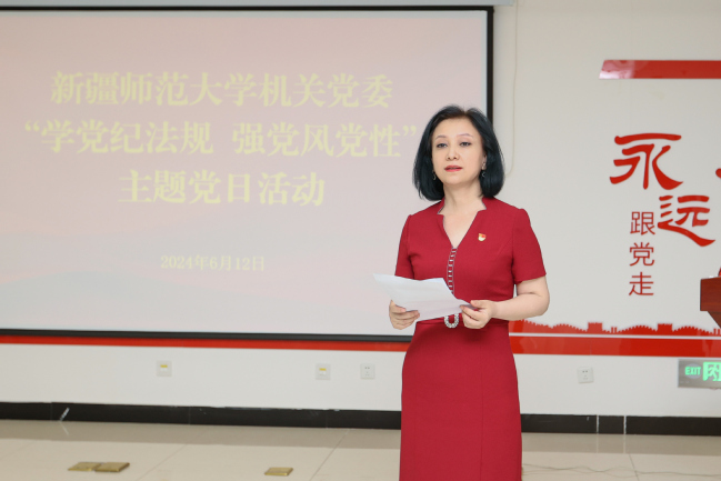 参观结束后,全体党员来到党性修养主题教室开展“学党纪法规 强党风党性”主题党日活动,吾满江·艾力校长带领机关党委党员代表重温入党誓词,全体党员观看了警示教育片,党校办支部党员胡丽红同志、宣传部支部党员王亮丁同志作为党员代表结合工作实际交流发言。通过交流研讨,党员干部深化了对党中央在全党开展党纪学习教育的重大意义,大家一致认为机关党员要发挥好表率作用,严格遵守党纪国法,自觉接受师生监督,以实际行动彰显党员的先进性和纯洁性。