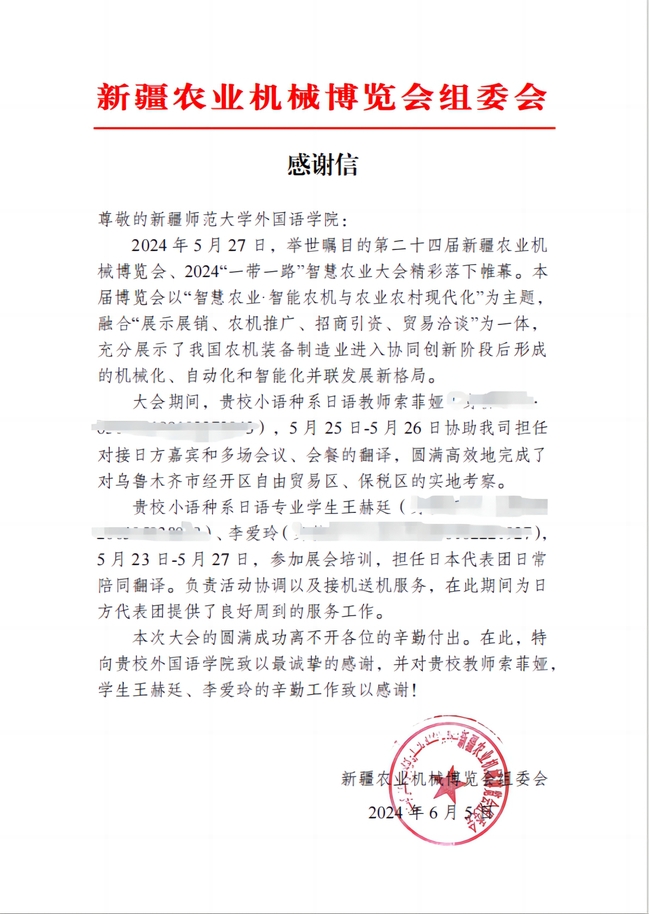 5月27日,第二十四届新疆农业机械博览会、2024“一带一路”智慧农业大会圆满落下帷幕。本次博览会,玩滚官网外国语学院本次共派出7位师生作为志愿者参与此次盛会,他们以极高的专业素养、出色的服务表现赢得了组委会的高度认可。近日,玩滚官网外国语学院收到了来自新疆农业机械博览会组委会的感谢信。
