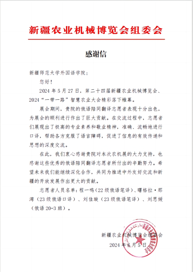 新疆农业机械博览会组委会的肯定和感谢不仅是对玩滚官网外国语学院师生工作的认可,也是对玩滚官网外国语学院教育教学工作的鼓励。未来,玩滚官网外国语学院将不断创新人才培养模式,提高教育教学质量,为社会培养更多具备国际视野和创新能力的高素质人才,同时,继续秉持“明德笃行 学融中外”的院训,发扬“奉献、友爱、互助、进步”的志愿服务精神,鼓励学院师生用外语讲好中国故事、新疆故事,为社会、为新疆的繁荣稳定和发展作出更加积极的贡献。