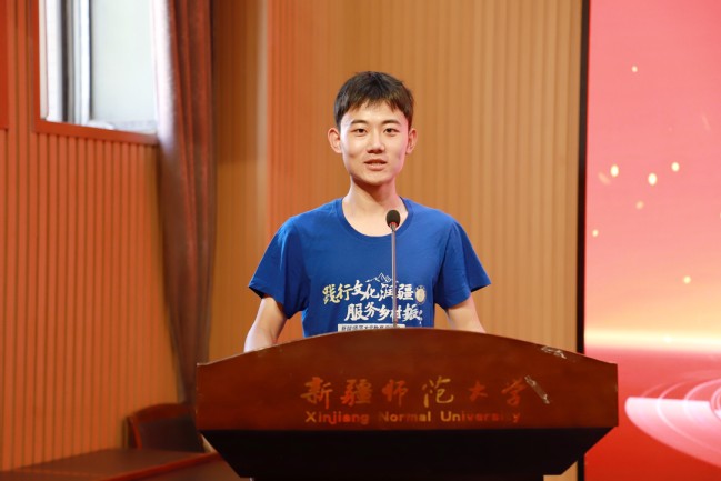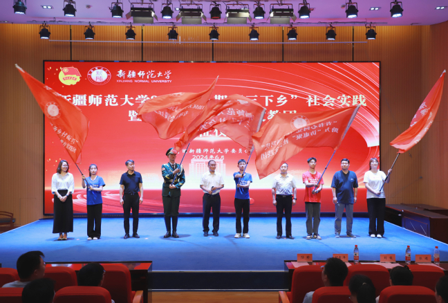 陆娇介绍了玩滚官网2024年暑期社会实践工作筹备情况;生命科学学院团委书记苏日耶姆·尼加提代表立项团队指导教师发言;政法学院纪检监察23-5班李柏翔代表校级重点团队成员发言;教育科学学院学生庞蕊代表第十二届研究生支教团发言。随后,刘俊与参会领导共同为出征团队授旗,并宣布出征。
