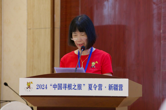 参营单位教师代表、荷兰领队徐谊梅分享了自己多年来带领华裔青少年参加“中国寻根之旅”夏令营的经历和感受,对新疆营的举办表示了高度的赞扬和期待,并鼓励营员们珍惜这次难得的机会,深入了解中华文化,感受温暖和关怀。