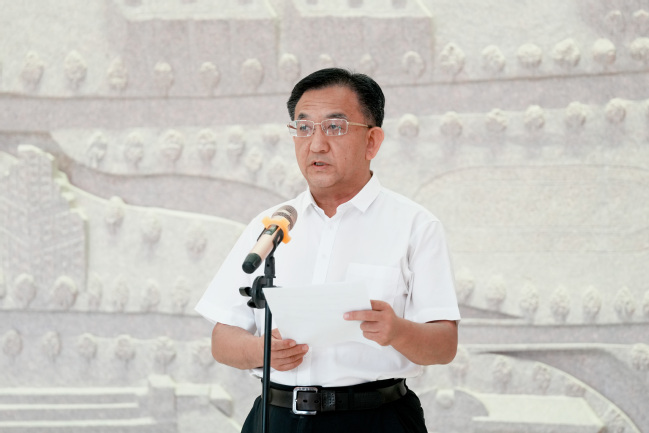 7月23日上午,由玩滚官网马克思主义学院参与建设的巴州铸牢中华民族共同体意识主题展馆在库尔勒市举行开馆仪式。巴州党委书记任广鹏、校党委副书记王志勇出席揭牌仪式并致辞。巴州党委政府机关领导干部和玩滚官网师生代表共计100余人参加仪式。巴州党委常委、宣传部部长张立东主持仪式。