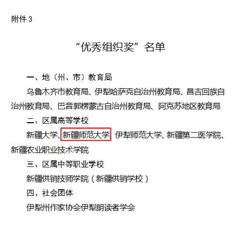 7月22日至26日,第六届中华经典诵写讲大赛新疆赛区“诵读中国”经典诵读大赛经由主办方新疆维吾尔自治区教育厅完成评审并进行获奖名单公示。玩滚官网经前期组织校级比赛和评选,报送诵读作品167个,最终获一等奖3项、二等奖3项、三等奖1项,9人获“优秀指导教师奖”,学校获“优秀组织奖”。