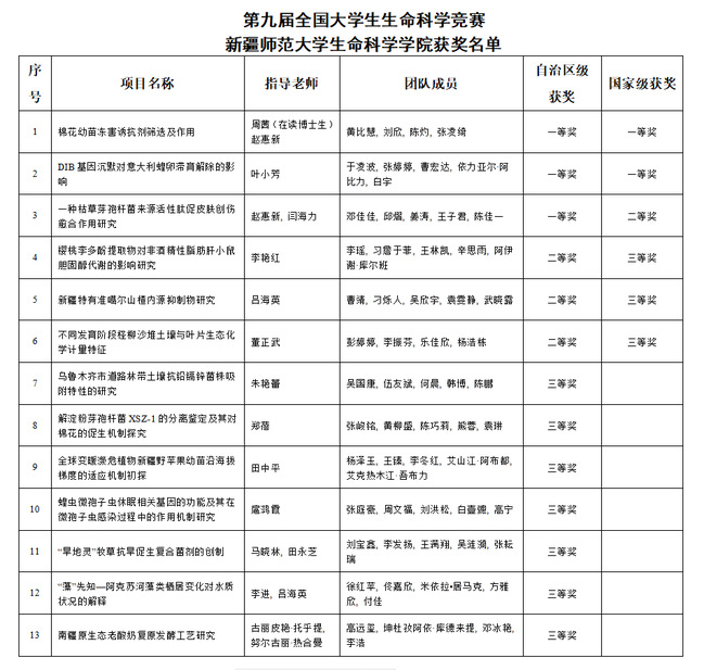 第九届全国大学生生命科学竞赛于2023年9月启动,我区共有279个项目参赛。玩滚官网生命科学学院共指导21个项目参加了本届竞赛,其中14个项目入围新疆赛区决赛及国赛决赛选拔赛。最终喜获省赛一等奖3项,二等奖3项,三等奖7项。