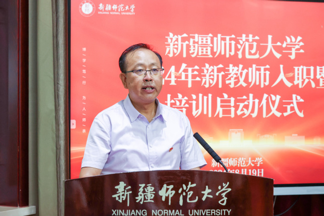 陈彤在致辞中代表学校对新教师入职表示衷心祝贺与热烈欢迎,表达了学校对新教师的重视与关怀,介绍学校建设历史及教育事业发展的形势和规划,并对新教师提出期望和要求:一是修炼内功,与奋进中的新师大同心同行;二是心有大我,勇于担当教育事业改革发展的时代重任;三是潜心立德树人,自觉践行教书育人使命。