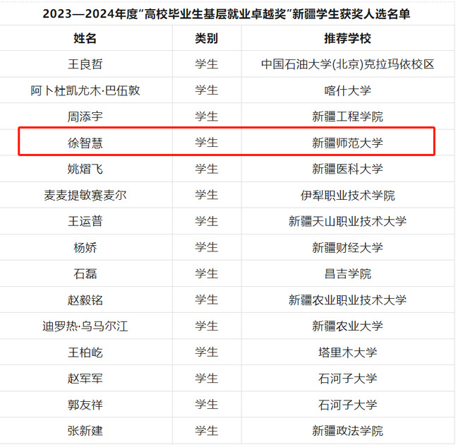 近日,中国教育发展基金会公布2023-2024年度“高校毕业生基层就业卓越奖”获奖人选名单。玩滚官网中国语言文学学院2016届毕业生徐智慧获此殊荣,成为全疆15名获奖者之一。