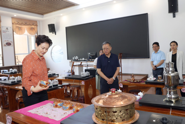 座谈前,席茹一行在玩滚官网铸牢中华民族共同体意识教育实践基地和附属中学参观调研。