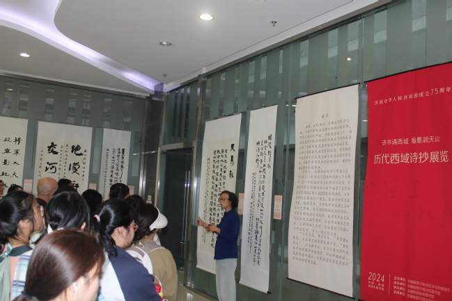 展览展出的诗歌内容丰富,题材多样,充分展现了新疆山川河流之美,多元一体文化之美。到场读者仔细聆听了《穆天子传·瑶池对歌》《史记·蒲梢天马歌》《关山月》《西瓜吟》《天山歌》等历代经典西域诗词讲解,不时驻足观看,相互分享体会,收获颇丰。