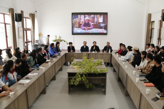 随后,师生一行与刘亮程先生开展座谈活动。刘亮程先生对学院师生到来表示热烈欢迎,分享了书院建设的心路历程以及近期的创作心得。在交流环节中,刘亮程先生讲到书院是第十一届矛盾文学奖获奖作品《本巴》的成书之地,并就小说、散文作品中的角色设定、创作灵感、情节构思等问题与师生们交流感悟,阐述了自己的生命观、宗族观和文学观。通过重温经典著作,师生深入了解先生的文学成就与创作理念,探索先生的创作世界。交流中师生们纷纷阐述见解,与刘亮程先生积极互动,会场气氛热烈。