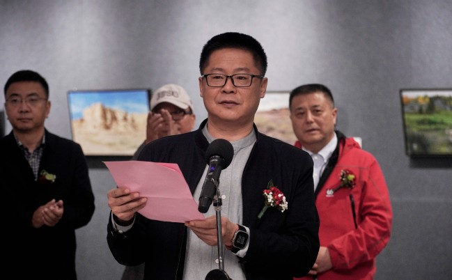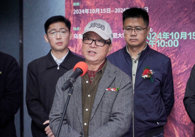 蒋世国代表所有参展艺术家致辞,分享了艺术家们在新疆采风的感悟,表示通过这次采风活动,艺术家们得以深入体验新疆的自然风光、人文历史和民族风情,这些体验无疑会激发他们的创作灵感,将把这些记忆与感动融入画作,加强与新疆同仁的交流,为新疆的文化润疆贡献力量。