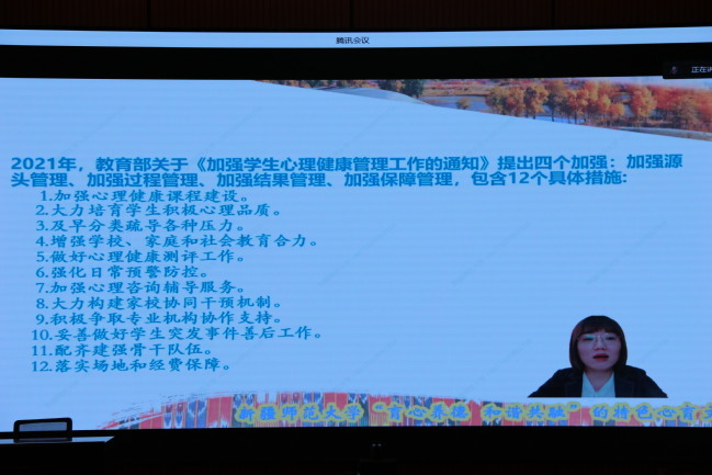 培训中,自治区高校思政与心理健康教育专家库专家、乌鲁木齐职业大学冯宏丽教授,就后疫情时期学校心理工作需要加强的重点提出要求,并结合典型案例讲解突发事件处置方法。