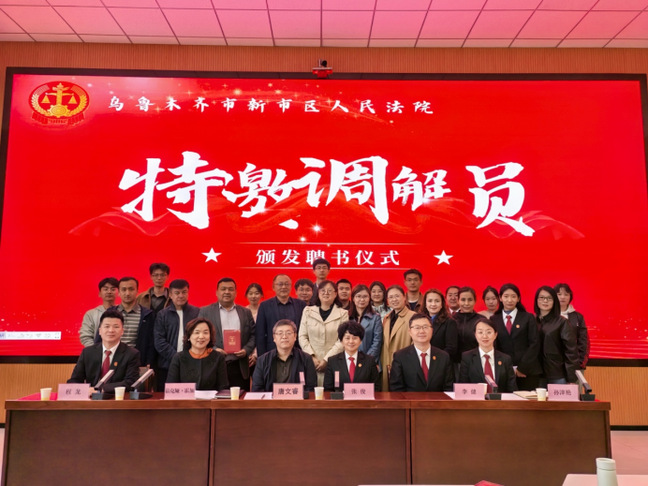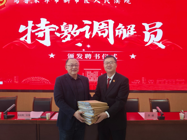 为推动溯源治理工作开展,健全多元纠纷解决机制,4月28日下午,乌鲁木齐市新市区人民法院党组书记张俊、副院长李健一行人前往玩滚官网政法学院,为学院12名教师颁发“特邀调解员”聘任证书。活动由政法学院副院长茹克娅·霍加教授主持。