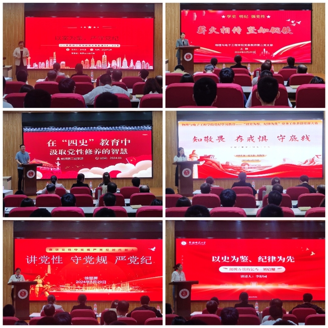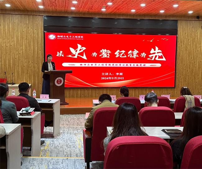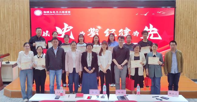 为推动党纪学习教育走深走实,增强党课教育的针对性、生动性、思想性,充分挖掘党史和党纪中的红色故事、名家事迹、纪律印记和廉洁元素,切实提升全院师生党员的理论素养和政治自觉,5月29日,物理与电子工程学院在文史楼二楼议课厅开展了“以史为鉴、纪律为先”党务工作者微党课大赛。比赛评委由学院党委书记李莉,学院党委副书记、院长向梅,学院学术院长程振洲,学院党委副书记、纪委书记买星和地理科学与旅游学院党委副书记、纪委书记高丽倩担任。共有12名党务工作者参加比赛,学院全体师生党员在现场观摩。