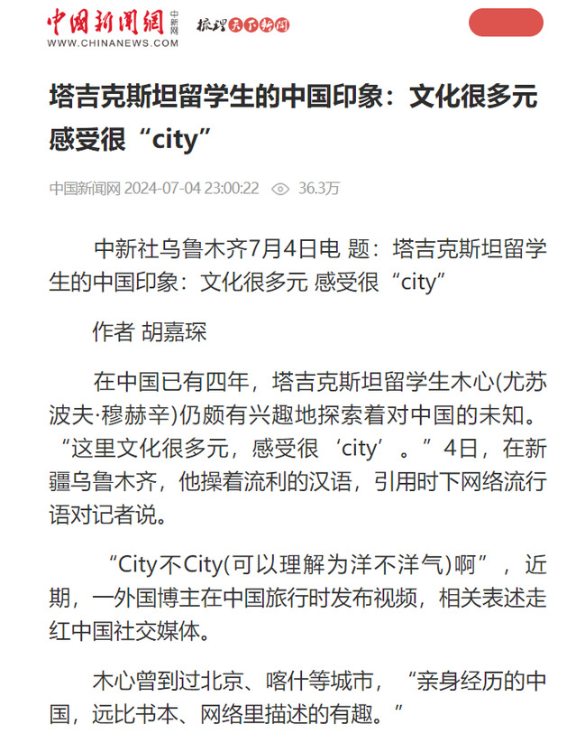在中国已有四年,塔吉克斯坦留学生木心(尤苏波夫·穆赫辛)仍颇有兴趣地探索着对中国的未知。“这里文化很多元,感受很‘city’。”4日,在新疆乌鲁木齐,他操着流利的汉语,引用时下网络流行语对记者说。