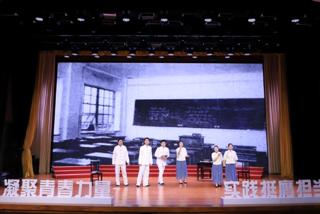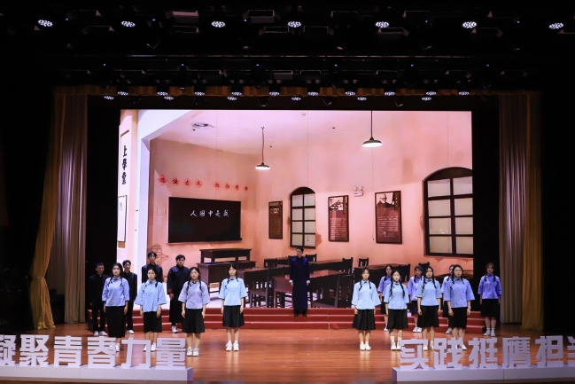 “民族危亡,匹夫有责,青春热血,铸就辉煌!”伴随着响亮的口号声比赛拉开帷幕。10支参赛队伍采用“诵读+舞蹈”“诵读+话剧”等形式,为观众带来了一场精彩的视听盛宴。《战火中的青春》《属于中国的曙光》《红色精神的传唱》《怒吼吧!救国会告全国民众书》气势磅礴,带领观众感受革命先辈们心系家国、不畏艰险的崇高精神,传递出了革命先烈为了革命事业的伟大胜利抛头颅、洒热血的豪情壮志。《那一年,中国青年正十八》《觉醒年代》《信仰的力量》饱含了热血青年对党和国家的无尽热爱和依恋,表达出他们承先辈志,坚定信仰,为党和国家事业贡献青春力量的决心和意志。《未来已来,将至已至》《因为爱留下》《奋斗吧!青年》讴歌新时代党和国家取得的辉煌成就,表达了青年学子坚定不移跟党走、到祖国最需要的地方建功立业的决心。大学生艺术团带来的合唱《灯火里的中国》、朗诵《师大,我向您报告》展现出新师青年团结向上、开拓进取的精神风貌。参赛选手们铿锵有力的声音、真挚动人的情感赢得现场观众深深共鸣,整场比赛气势恢宏、高潮迭起,掌声阵阵。